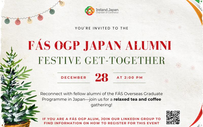 Calling all alumni of the FÁS Overseas Graduate Programme (OGP) in Japan to join IJCC Director Dominic Keogh and a small group of FÁS OGP alumni for an informal festive meet-up in Dublin this December. We’d love to reconnect with as many former participants as possible – whether you were based in Japan in the 1980s, 1990s, or 2000s.